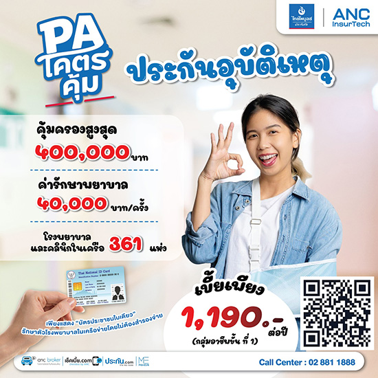 ประกันอุบัติเหตุ PA ค่ารักษา 40,000 บาท เบี้ย 1,190 บาท ไม่ต้องสำรองจ่าย เมื่อรักษาในโรงพยาบาลที่อยู่ในเครือ