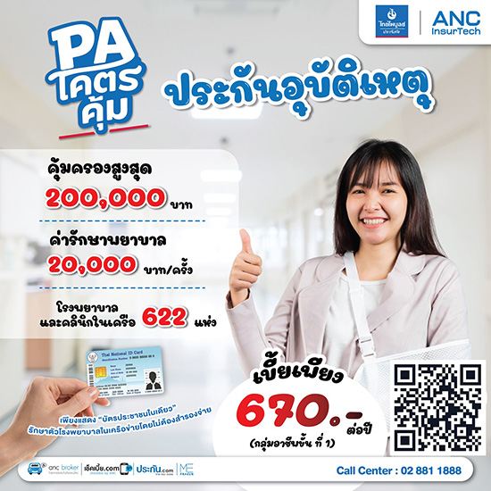 ประกันอุบัติเหตุ PA ค่ารักษา 20,000 บาท เบี้ย 670 บาท ไม่ต้องสำรองจ่าย เมื่อรักษาในโรงพยาบาลที่อยู่ในเครือ